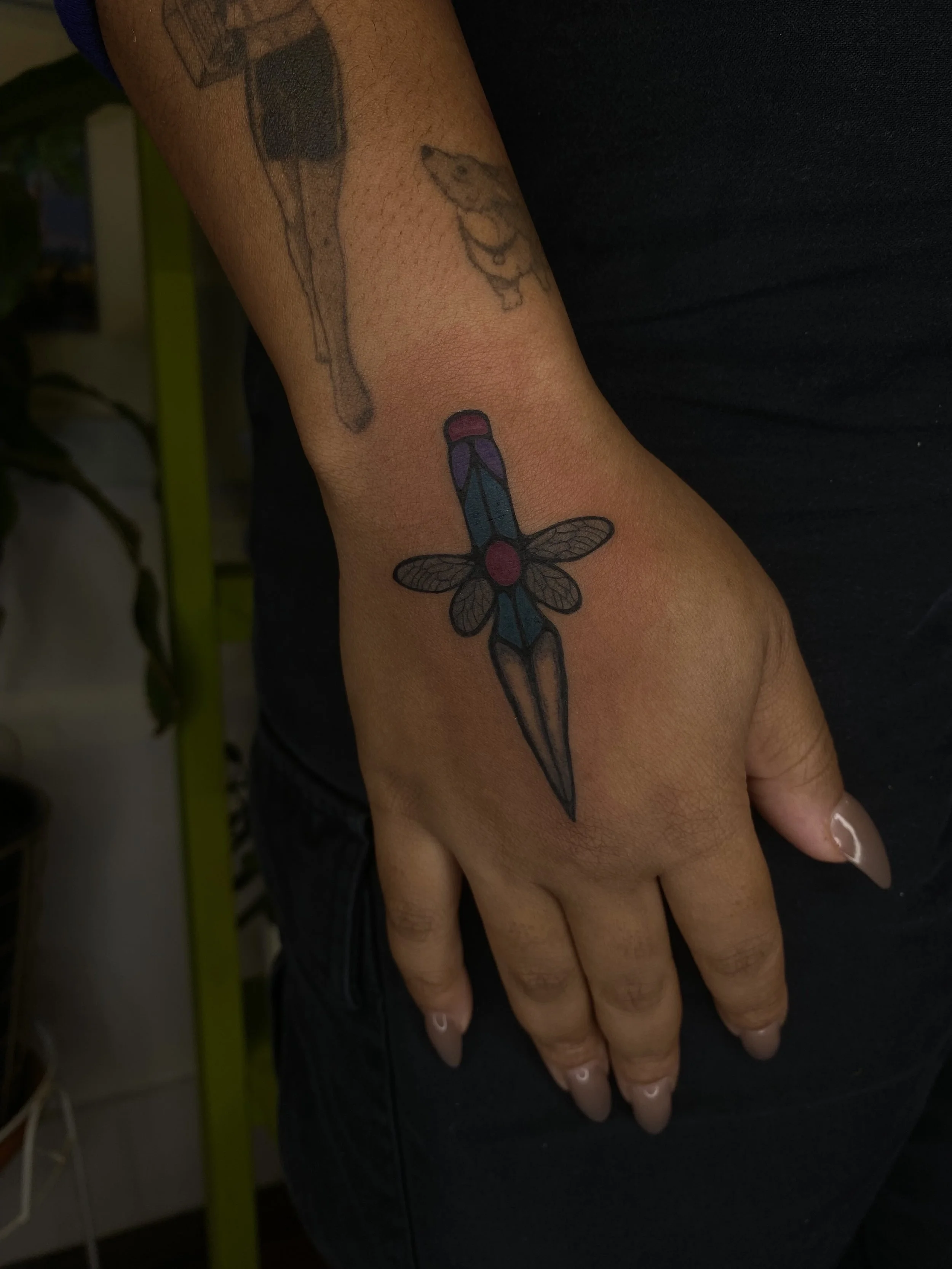 She’s a resident artist and co-owner of Obsessed Tattoo Collective, a studio she shares with two other tattoo artists and a tooth gem + grillz artist. Tattooing has been more than a career shift for her; it’s a way to create meaningful art, connect with kind and inspiring people, and build a supportive, collaborative community.