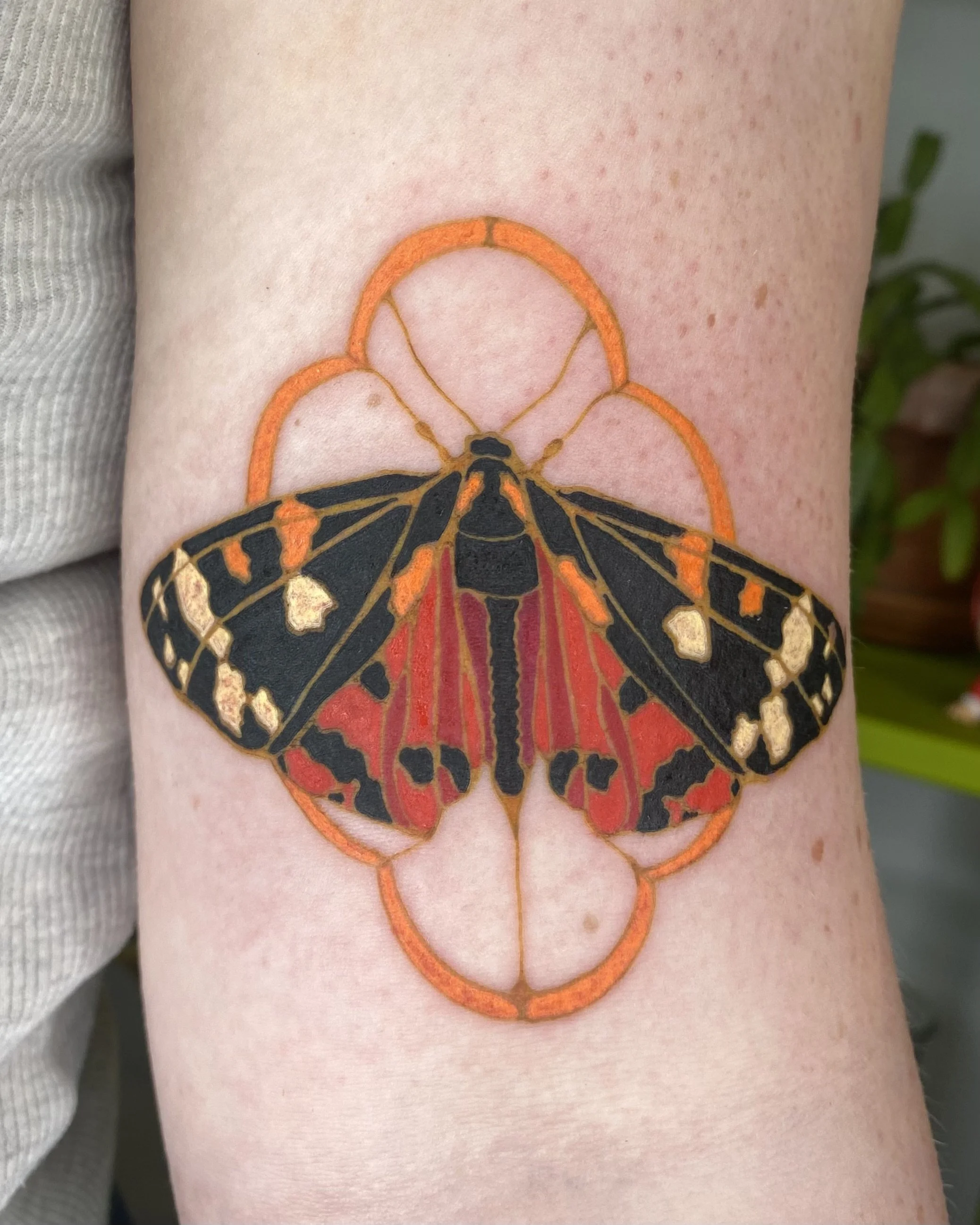 I design most of my stained glass flash, but I’ve also collaborated with some amazing stained glass artists. I’ll turn their work into tattoos, and they’ll turn my tattoo designs into actual stained glass. It’s such a fun way to connect with other creatives and see the same design in completely different art forms.