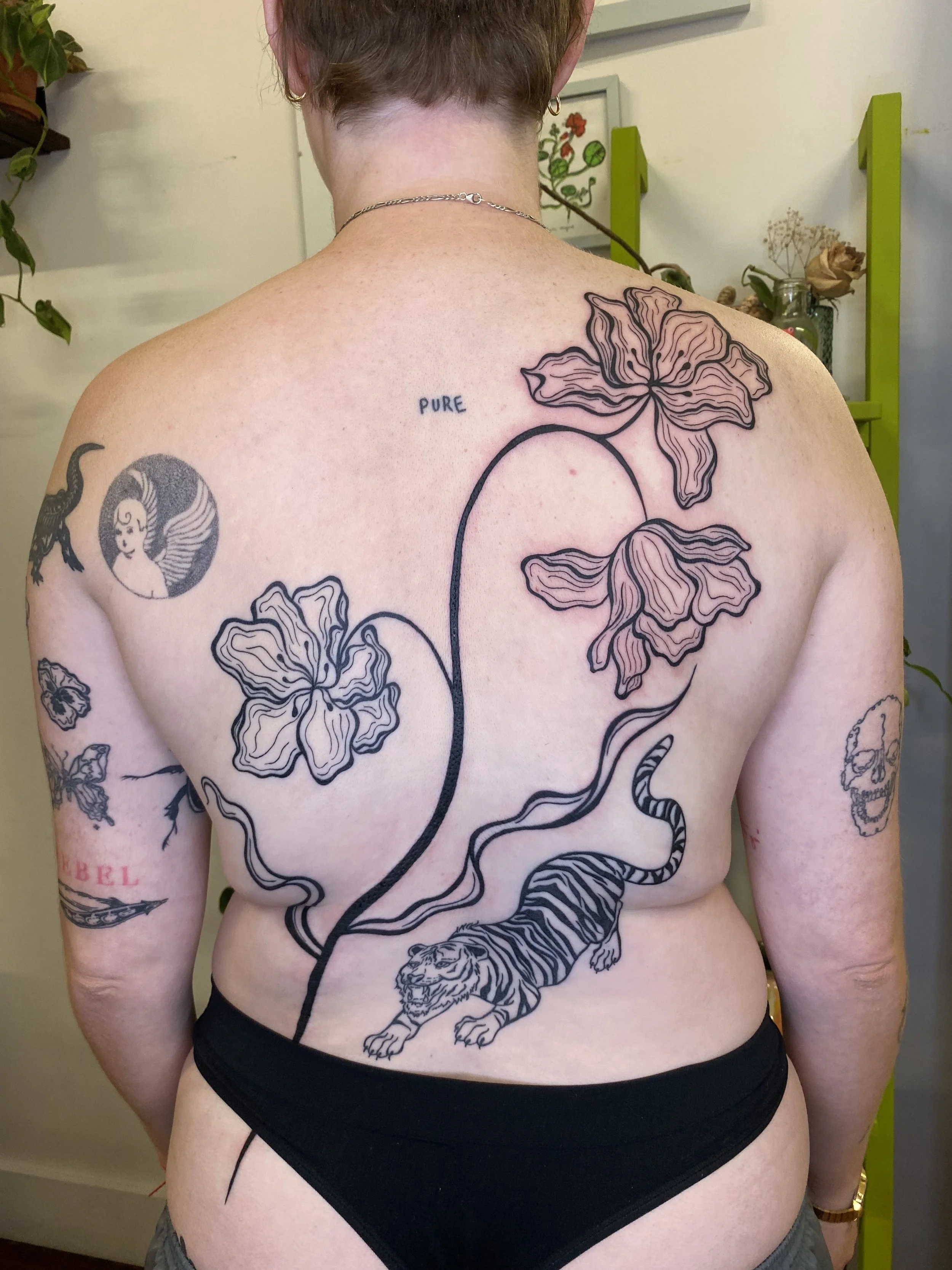 Custom back piece! Abstract flower + tiger. Done in 3 sessions over 7 weeks.