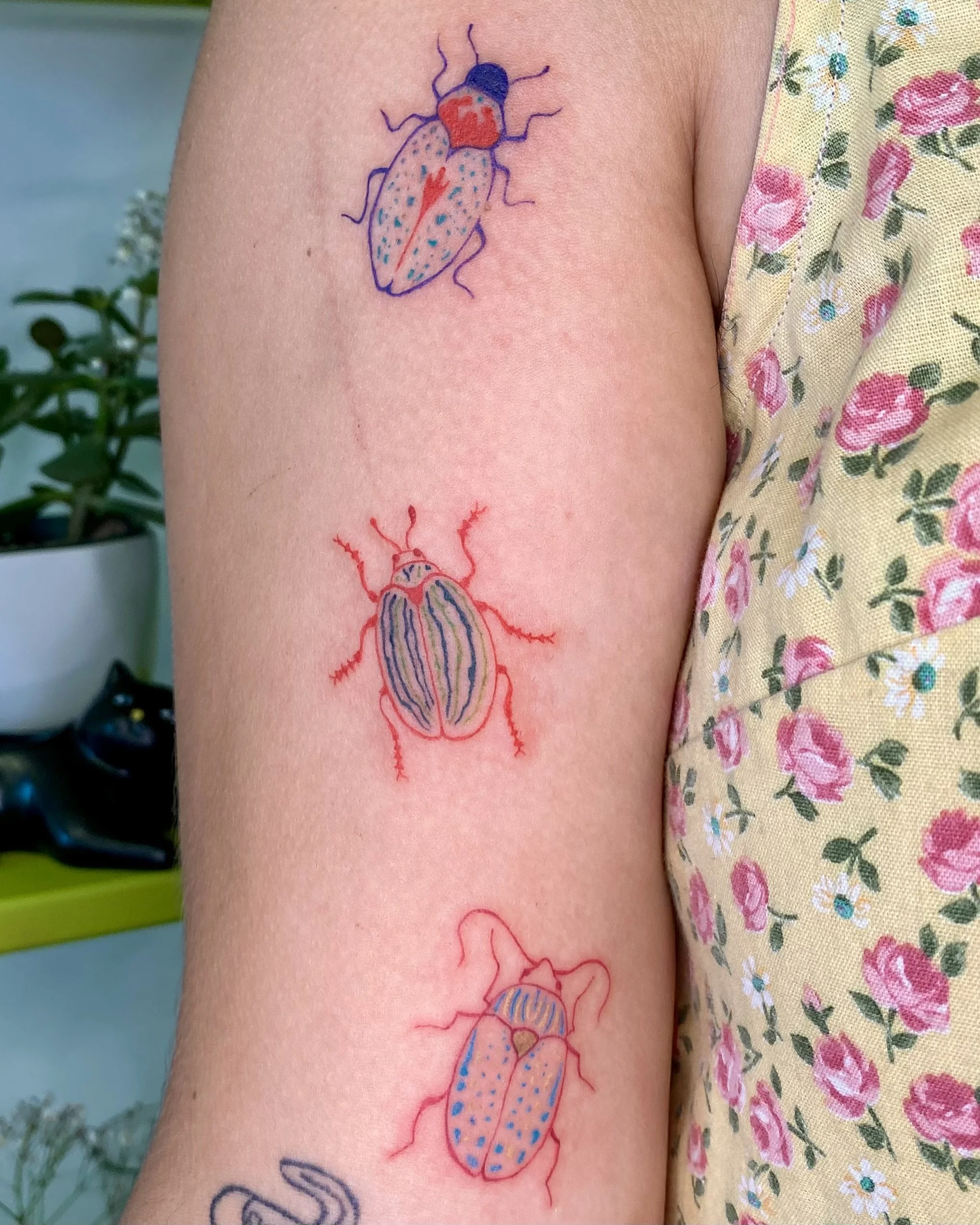 Emily (she/her) is a self-taught tattoo artist based in Brooklyn, New York, known for her vibrant color work. Her designs often feature stained glass elements, florals, expressive animals, and illustrative landscapes.
