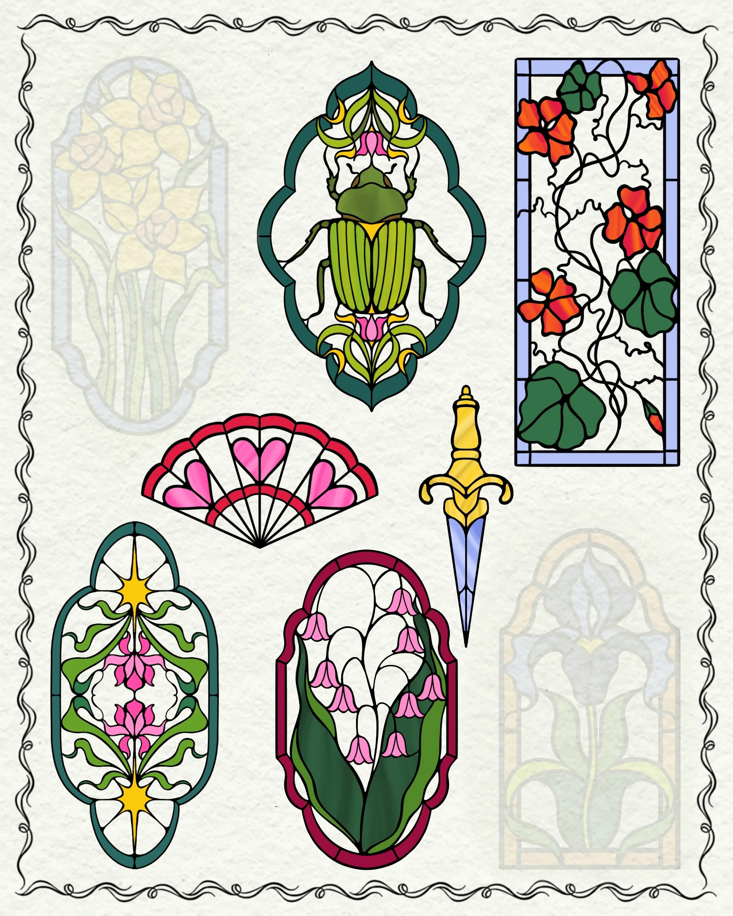 All of my designs — with the exception of my stained glass pieces — can be done in black ink.